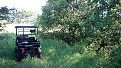 Eventually we stop rubber necking at the water/erosion control features and get back on the path to work! We pull into a corner of the field we need to cross to get to our net site in the woods somewhere in the back 40.